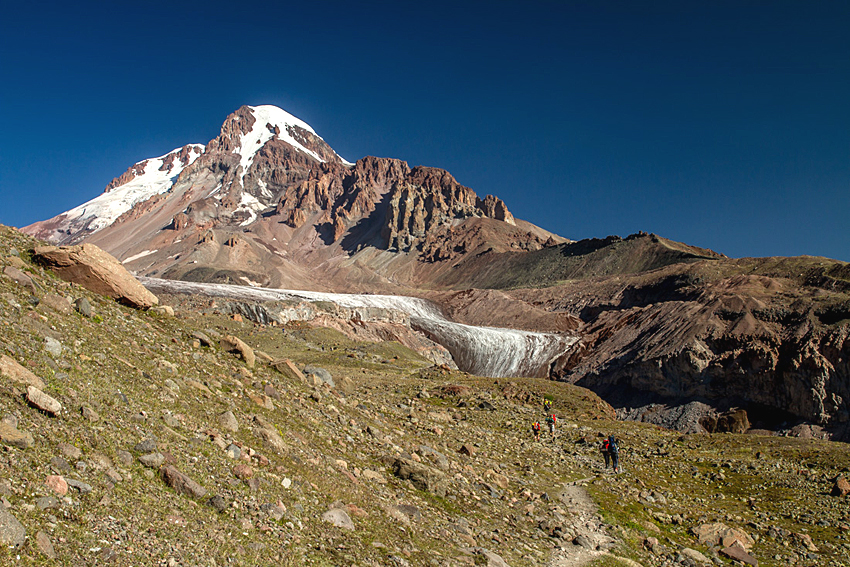 Transfer zum Dreifaltigkeitskloster von Gergeti aus dem 14. Jahrhundert (2.200 m), das eindrucksvoll vor dem Gipfel des Kazbek (5.047 m) liegt. Von da Wanderung zur Gletscherzunge des Gergeti-Gletschers (3.300 m). Der Rückweg erfolgt über dieselbe Strecke oder über das Dorf Toti zum Dorf Arsha. Von da oder vom Kloster Gergeti Autotransfer nach Stepanzminda.