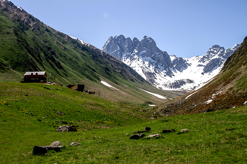 Autotransfer zum Dorf Djuta. Von da Wanderung im Chaukhi-Gebirge über den Sadzele-Pass (3.056 m) zum Dorf Roshka.