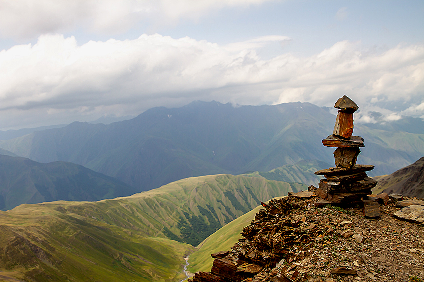 Wanderung über den Adsunta-Pass (3.431 m), von wo aus sich ein hervorragender Panoramablick eröffnet. Hier verläuft die Grenze zwischen den Provinzen Chewsuretien und Tuschetien. Abstieg zum Zeltplatz Kvakhidi.
