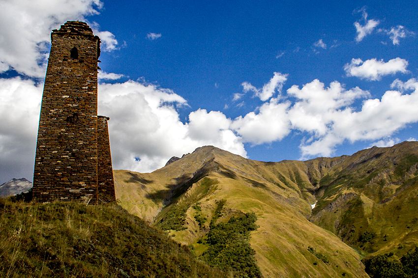 Wanderung über den Gudani-Bergrücken(3.020 m) mit herrlichen Panoramablicken zur verlassenen Festung Kistiani. Autotransfer nach Shatili, einem alten Wehrturmdorf kurz vor der Grenze nach Tschetschenien.